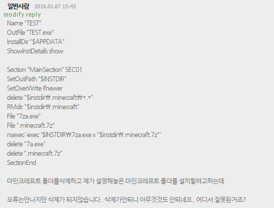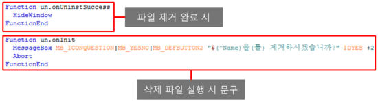 경고: 언인스톨러에 RMDir /r $INSTDIR 를 사용하면 위험할 수도 있습니다. 만약 사용자가 Program Files 폴더를 경로로 설정하면 진짜 Program Files를 날려버릴겁니다.