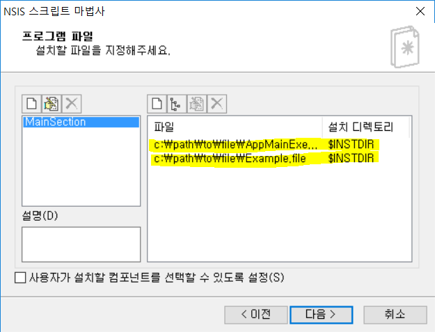 위 그림에서 노란색 부분을 전부 삭세하고 설치할 실행 파일과 관련 DLL, DB 파일들을 추가한다.