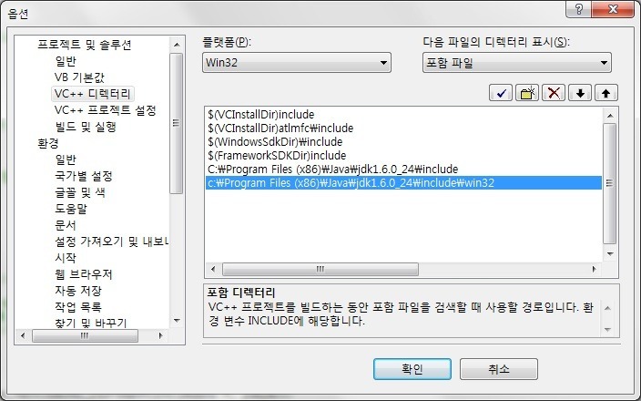 아래의 경로 처럼 include 경로를 visual c++ 디렉토리로 추가해준다.