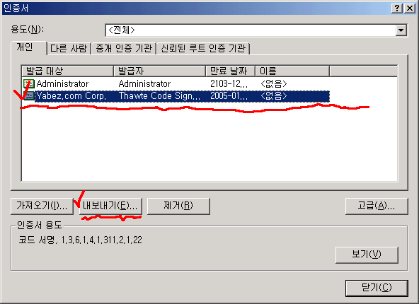 - 예에서는 e-yabez.pfx 로 내보냄 (내보낼때 암호는 알아서...)