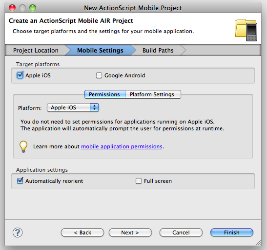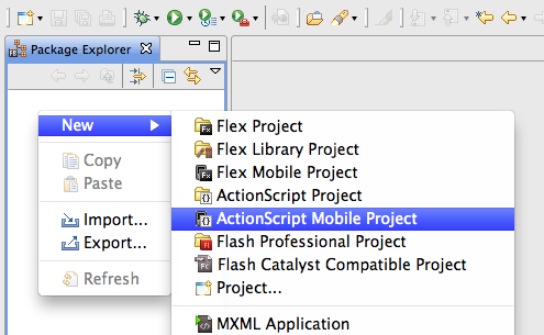 "Package Explorer"에서 우클릭 > New > ActionScript Mobile Project를 선택합니다.
