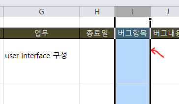 버그항목의 셀 부분을 업무와 종료일 사이에 넣어 봅시다.