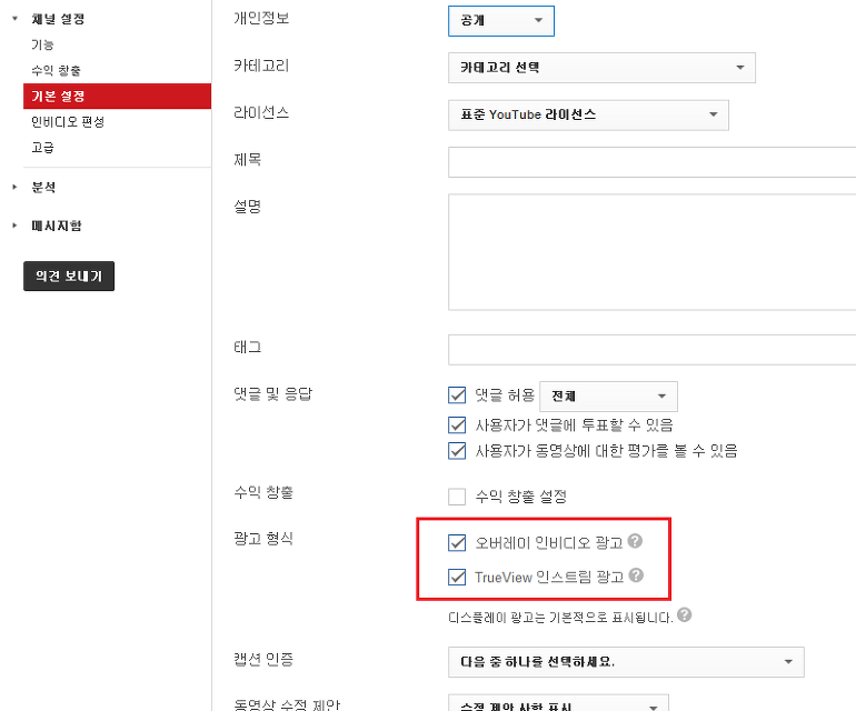 한개의 동영상을 올릴 때마다 또 따로 설정할 수도 있습니다. 위 설명은 단지 기본값의 설정일 뿐입니다.