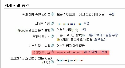 그리고 마지막으로 구글 애드센스 계정에 들어가면 제3자 액서스부분에 유튜브가 있는것을 확인 하실수 있습니다. 이렇게되면 정상적으로 연결이 된것이라고 보시면됩니다.