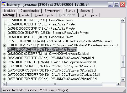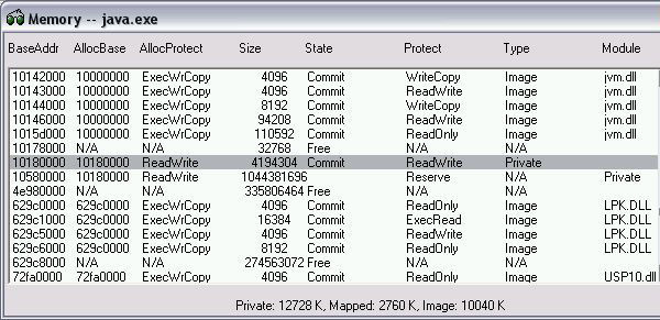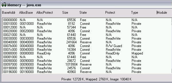 그림 7에서, 강조된 라인과 그 바로 밑에 것은 자바 힙에 상응한다. 여기에서 시작했던 자바 프로세스는 1000MB 힙 (-mx1000m사용)이 주어졌다. 이는 해당 프로그램에 있어 엄청나게 큰 것으로서 PrcView 맵에서 확실히 나타나있다. 강조된 라인은 힙의 커밋된 부분을 단 4MB로 보여주고 있으며 주소 0x10180000에서 시작한다. 강조된 라인 바로 밑에는 큰 reserved 확장인데 이것은 아직 커밋되지 않은 나머지 힙이다. 시작 시 JVM은 초기에 총 1000MB를 보유하고 있다.(0x10180000 에서 0x4e980000 까지의 주소범위를 사용 불가로 만든다.) 그리고 시작하는데 필요한 것을 커밋한다. 이 경우 4MB 이다. 이 값이 현재 힙 사이즈에 상응한다는 것을 확인하려면-verbosegcJVM 옵션으로 자바 프로그램을 호출한다. 그러면 가비지 컬렉터에서 자세한 정보가 프린트 된다.-verbosegc아웃풋에 있는 두 번째 라인의 두 번째 GC 에서 현재 힙 사이즈가 대략 4GB라는 것을 볼 수 있다: