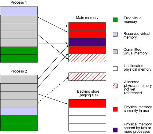 - Committed: 프로그램에 의해 접근할 수 있고 완전히 지원되는 메모리. 페이징 파일에서 메모리에 페이지 프레임이 할당된다. Committed 페이지들은 프로세스가 첫 번째로 이들을 참조할 때만 주 메모리로 로딩된다. 따라서on-demand paging이다.