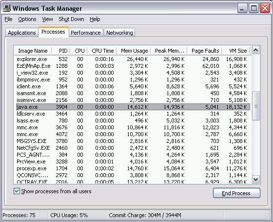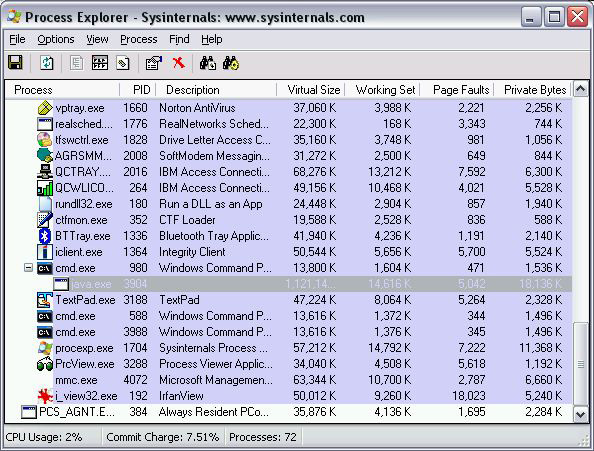 PrcView를 시작하면 Task Manager 같이 생긴 프로세스가 시스템에 나타난다. 스크롤을 이용하면 자바 프로세스가 하이라이트 되면 스크린은 그림 5 처럼 보인다.