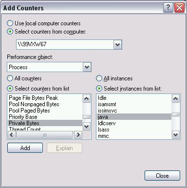 PerfMon 스크린의 상단에 있는 툴바에서+버튼을 클릭한다. 대화창이 나오고 검사 할 카운터를 선택할 수 있다. (그림 3a) 카운터는퍼포먼스 객체들로 알려진 범주들로 그룹핑된다. 메모리 사용과 관련된 두 가지는Memory와Process이다. 카운터 정의는Explain버튼을 클릭한다. 개별 창에 설명이 나온다.(그림 3b)