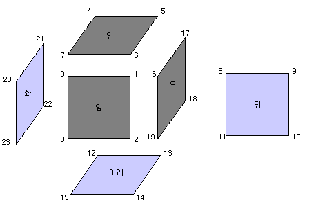 육면체는 사각형 6개로 구성되어 있지만 삼각형으로 쪼개서 그려야 하므로 12개의 삼각형이 필요하다. 정점 배열이 상당히 복잡해 보이는데 다음과 같이 각 정점에 번호를 붙여 두고 좌표를 생각해 보면 쉽게 구할 수 있다.