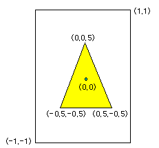 onDrawFrame에서 배경을 먼저 지우고 정점의 색상을 노란색으로 지정했다. glClear, glColor 함수는 OpenGL과 동일하다. 다음은 삼각형을 구성하는 3개의 정점 좌표를 배열에 정의한다. 디폴트 좌표계가 -1 ~ 1 사이이므로 이 범위안에 정점을 배치했다.