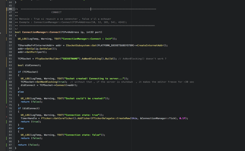 But i felt disappointed about the Connect step. Indeed , when the IP/Port are correct , the connection is established at once . But , when the IP is wrong or the server is shutdown , the editor freeze at least 30 sec then the log (that says i can't connect) shows up.