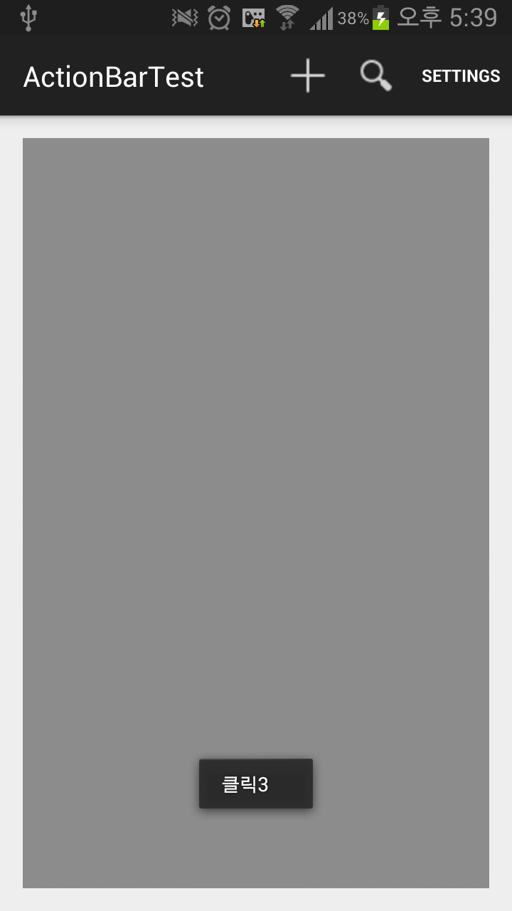 예제를 실행하면 다음과 같이 액션바가 표시되는것을 확인할 수 있습니다. 메뉴 리소스에서 설정한 것과 같이 첫번째와 두번째 항목이 액션 아이템으로 표시되고, 나머지 한 항목은 오버플로우 메뉴에 표시됩니다.