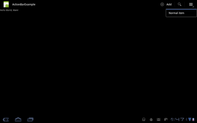 | <?xml version="1.0" encoding="utf-8"?> <menu xmlns:android="http://schemas.android.com/apk/res/android"> <item android:showAsAction="ifRoom|withText" android:id="@+id/item1" android:icon="@android:drawable/ic_menu_add" android:title="Add" /> <item android:id="@+id/item2" android:showAsAction="always" android:title="Action item with icon" android:icon="@android:drawable/ic_menu_search" /> <item android:title="Normal item" android:id="@+id/item3" /> </menu> |