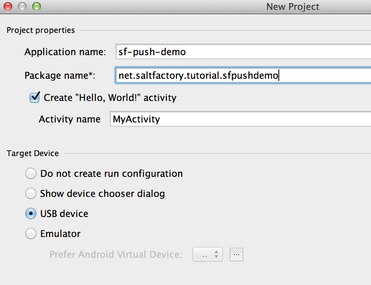 GCM을 테스트하기 위한 Android 프로젝트를 하나 만들도록 한다. 완성된 예제는 saltfactory-android-tutorial의 gcm-demo 브랜치에서 받을 수 있다.