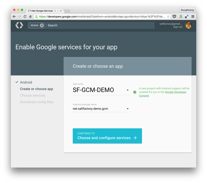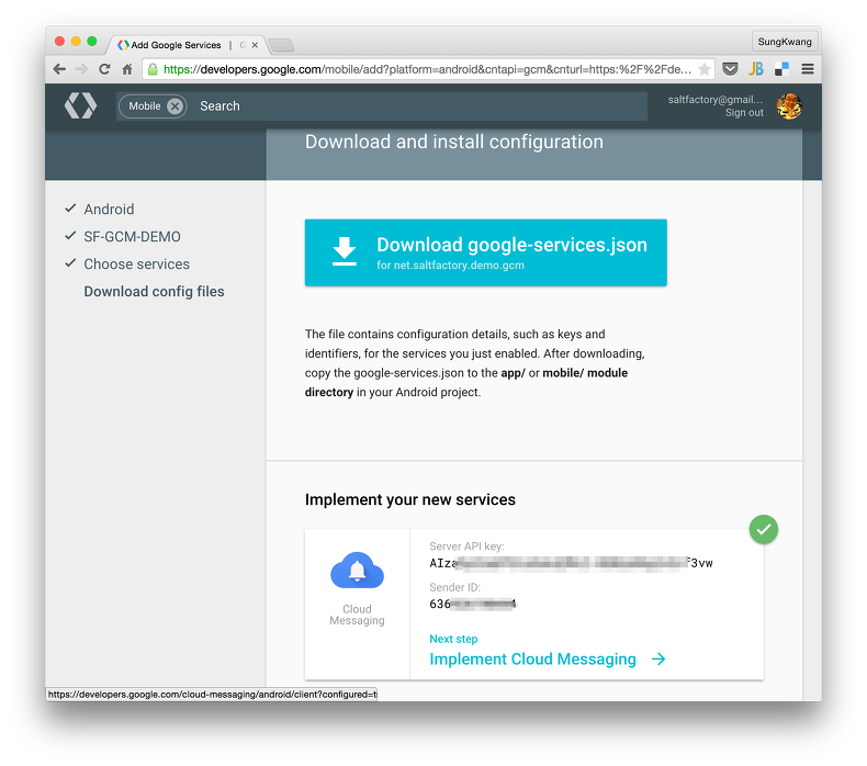 Continue Choose an configure services 버튼을 클릭한다. 등록하는 시간을 기다리면 다음과 같이 SF-GCM-DEMO 앱이 net.saltfactory.demo.gcm 패키지명으로 등록된 것을 확인할 수 있다. 앱을 등록하면 Google Sigin-in, Cloud Messaging, Analytics 서비스를 사용할 수 있다. 우리는 Cloud Messaging를 상용할 것이기 때문에 다른 설명은 생략한다.