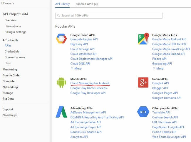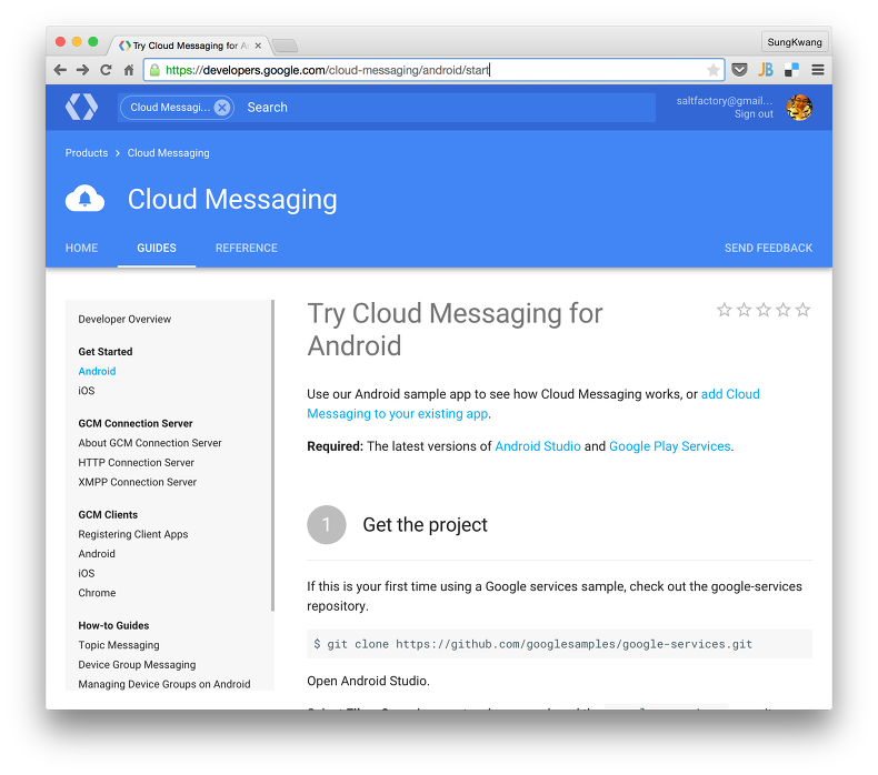 Android GCM 서비스를 개발하기 전에 GCM을 사용하기 위해 앱을 등록해야한다. Android GCM 사이트에 접속해보자. https://developers.google.com/cloud-messaging/