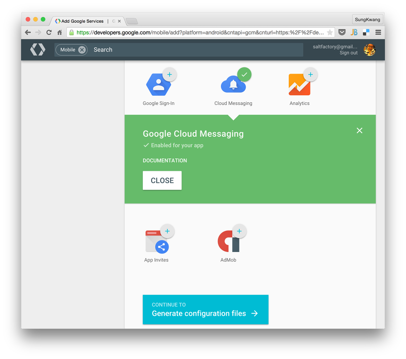 아래에 보면 Generate configuration files 라는 버튼이 보인다. 이전 GCM에서의 복잡한 설정을 간단하게 configuration file로 처리를 할 수 있게 GCM 서비스가 업그레이드 되었다. 설정 파일을 만들어보자.