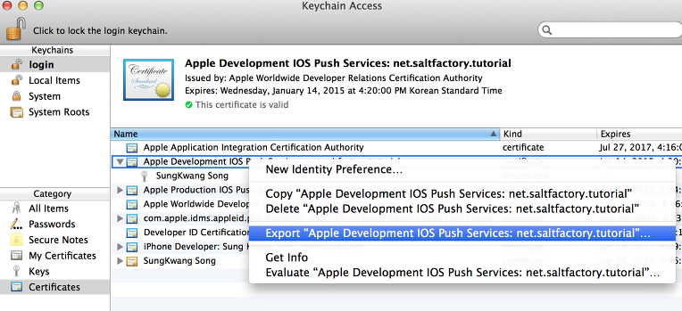 4. Locate the Certificate in the Keychain Access, expand it to see the Key inside,