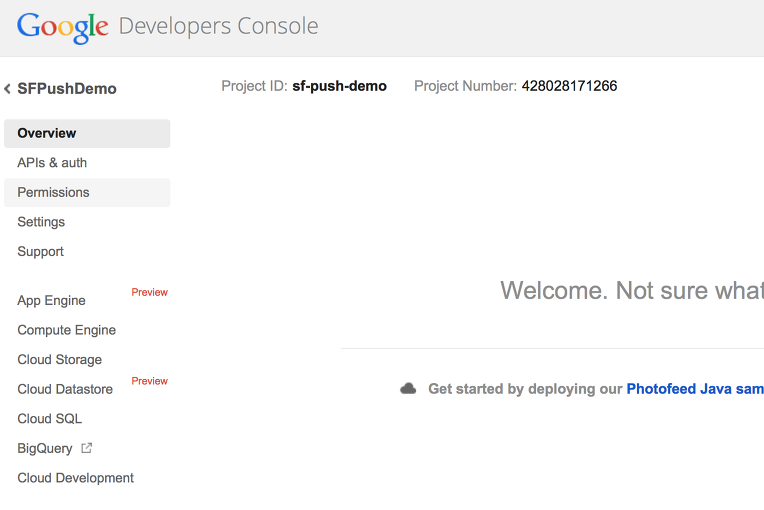 우리는 SF-GCM-demo라는 프로젝트를 이미 만들었고 GCM을 추가할 것이기 때문에 add Cloud Messaging to your existing app를 클릭한다.