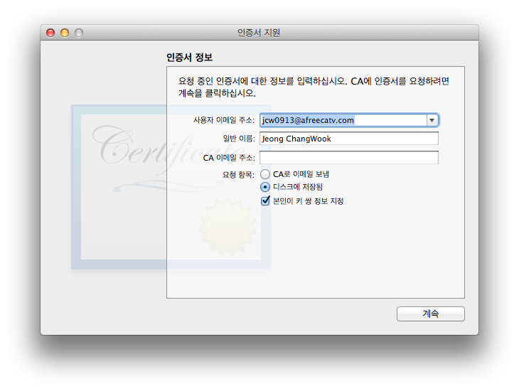 Enter the apple dev email into the Certificate Assistant form, select the "Save to disk" radio