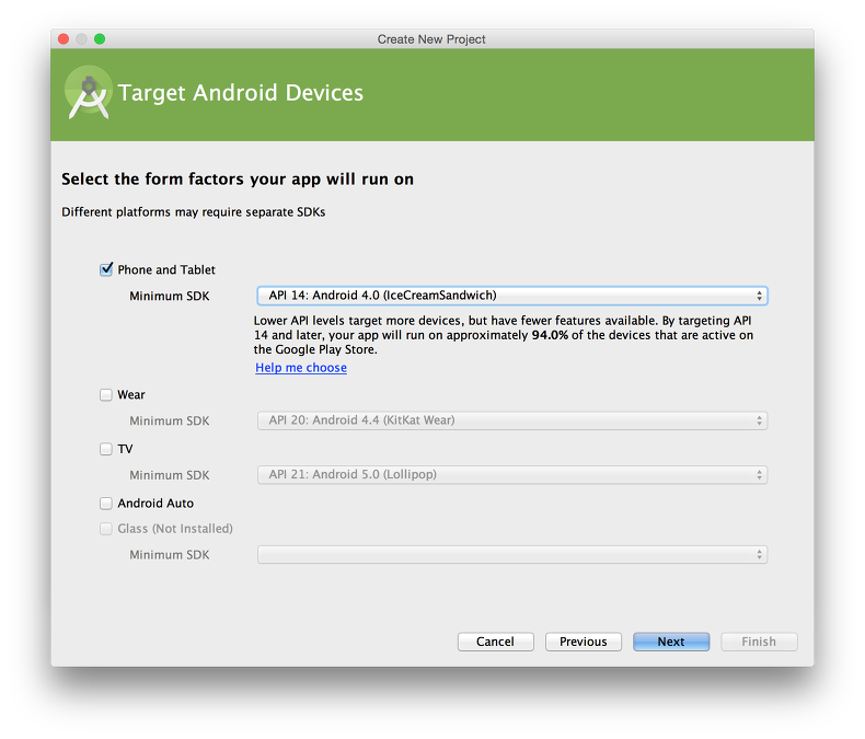 다음은 개발하고 싶은 SDK를 선택한다. 우리는 Android 스마트폰 GCM을 테스트할 예정이기 때문에Phone and Tablet Minimum SDK를 선택한다. 현재 연구에 사용하고 있는 Android 디바이스가 최신형이 아니기 때문에 API 14(Android 4.0)을 선택했다. 자신에 맞는 SDK를 선택하면 된다.