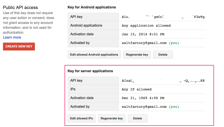 GCM 서비스가 업그레이드 되면서 설정하는 프로세스가 매우 직관적으로 변경되었다. 앞에서 설명하듯 차례차례 문서대로 진행하면 다음과 같이 Server API key와 Sender ID를 만들 수 있다. 이전에 블로그에 포스팅한 글의 가장 많은 질문이 Project ID를 어떻게 생성하는지에 대한 질문이였는데 GCM 업그레이드 이후 간단하게 생성할 수 있게 되었다.