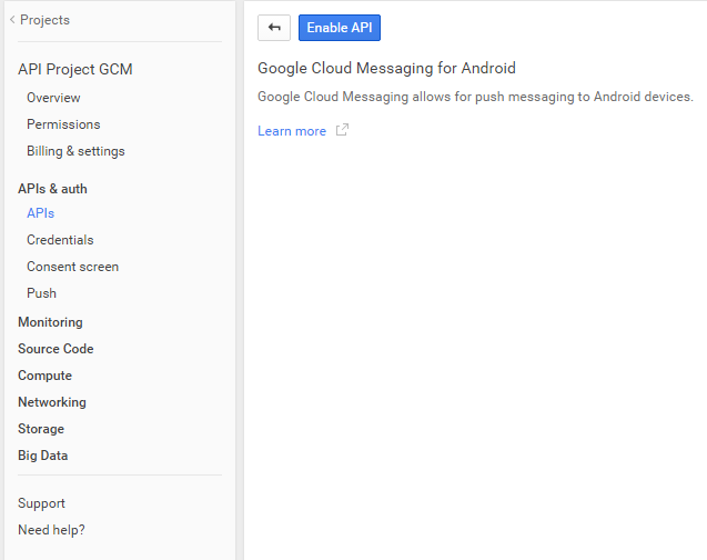 Google Cloud Messaging 탭을 보면 ENABLE GOOGLE CLOUD MESSAGING 버튼이 보인다. 이 버튼을 눌러줘야 GCM 서비스가 활성화 된다. 버튼을 클릭하자. 그러면 아래와 같이 GCM 서비스가 활성화 된 것을 확인할 수 있다. 이제 Google 서비스에 GCM에 관한 설정은 모두 마친 것이다.