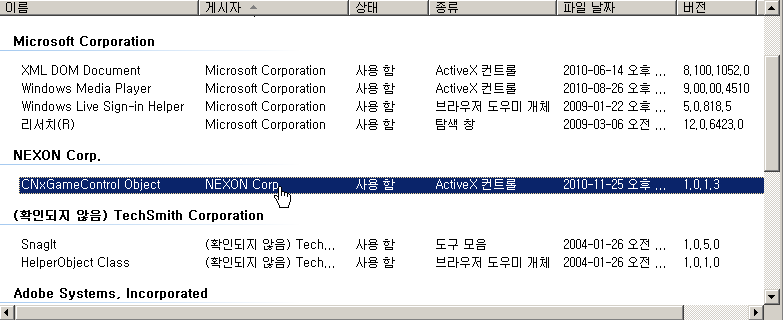 재미있는 구조다. IE에 설치된 ActiveX는 브라우저의 추가기능관리에서 확인할 수 있다