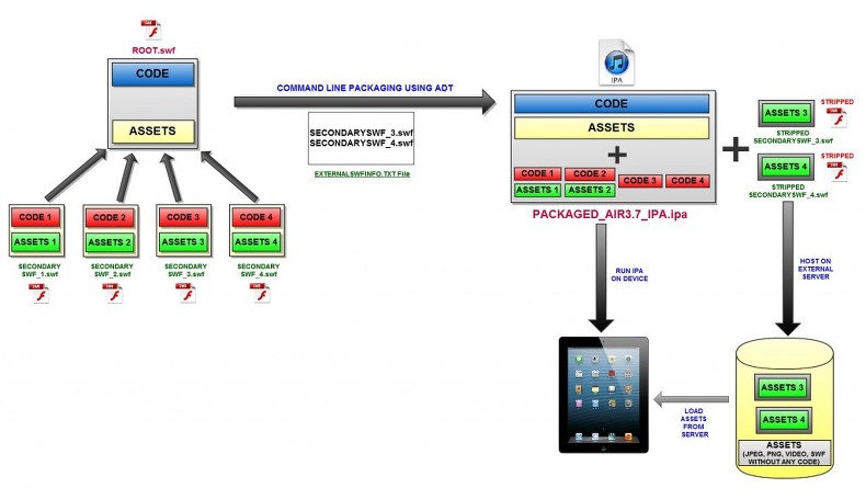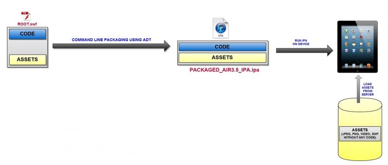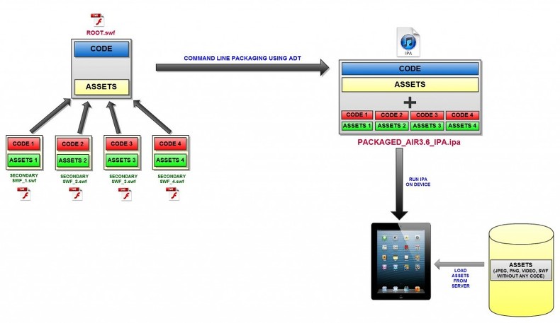 With AIR 3.6, the feature for loading of locally packaged secondary SWFs containing ABC code was introduced. The detailed description about this feature and its usage can be found at this blog – “Packaging and loading of multiple SWFs for AIR apps on iOS“. The workflow for the application developer using this feature is described in the diagram below: