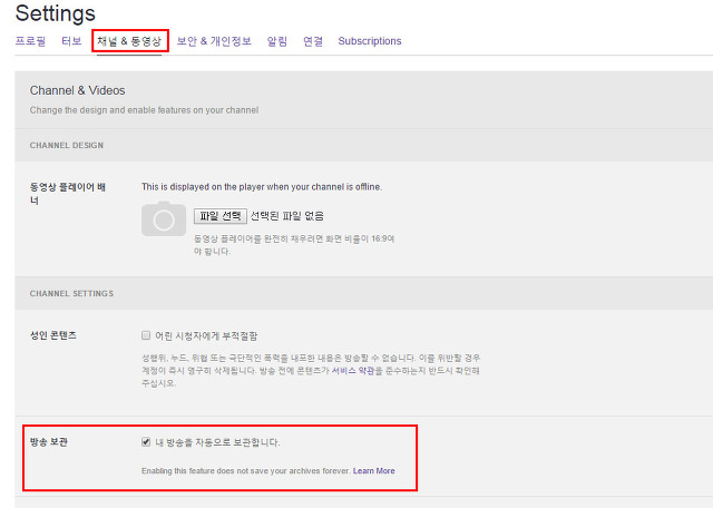 방송 보관에서 “내 방송을 자동으로 보관합니다.”의 박스에 체크를 넣어주세요.