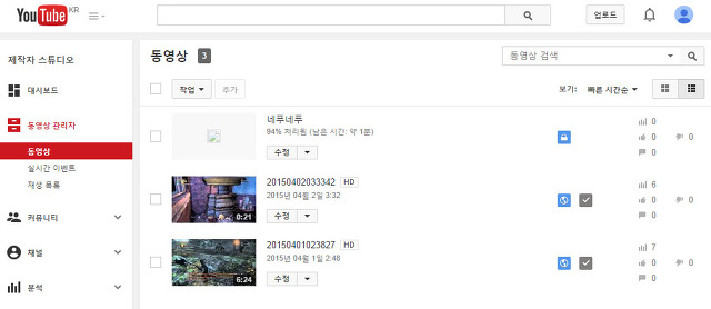 유튜브에서 제대로 진행되고 있는지 확인하시려면 유튜브의 메인 페이지에서 “내 채널”로 들어가신 후 “동영상 관리자”를 클릭해주세요.
