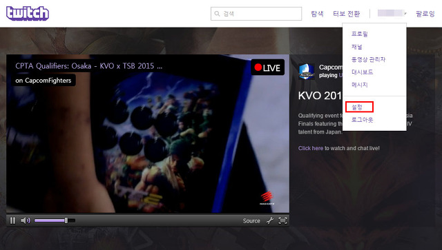 트위치에 로그인 하신 후 메인 화면에서 “설정” 페이지로 들어가주세요.