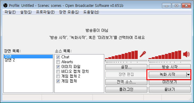 녹화하시려면 “방송 시작” 버튼을 누른 다음 “녹화 시작” 버튼을 누르시면 됩니다.