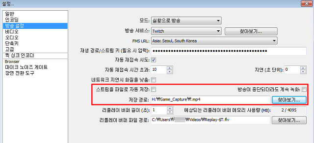 “스트림을 파일로 자동 저장”은, 방송 시작 버튼을 누르면 자동으로 하드 디스크에 방송이 저장되게끔 하는 설정입니다.