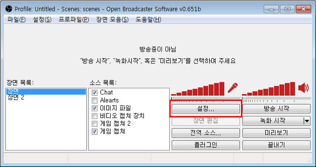 OBS의 ‘설정’ 버튼을 눌러주세요.