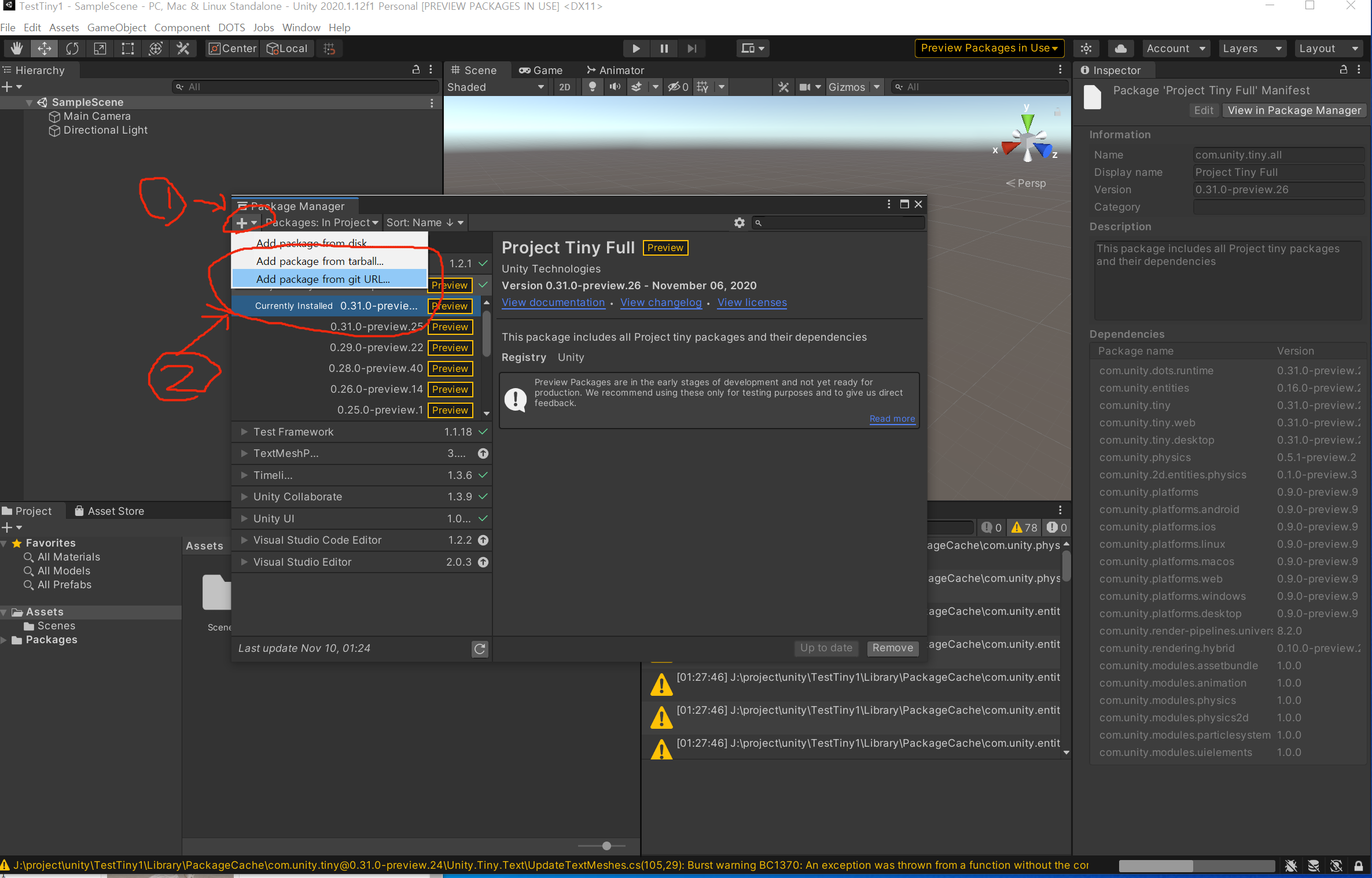 "com.unity.tiny.all" 라고 "그림번호1"과 같이 적어주시고 "그림번호1"에 "Add" 라고 쓰여진 버튼을 눌러주세요.