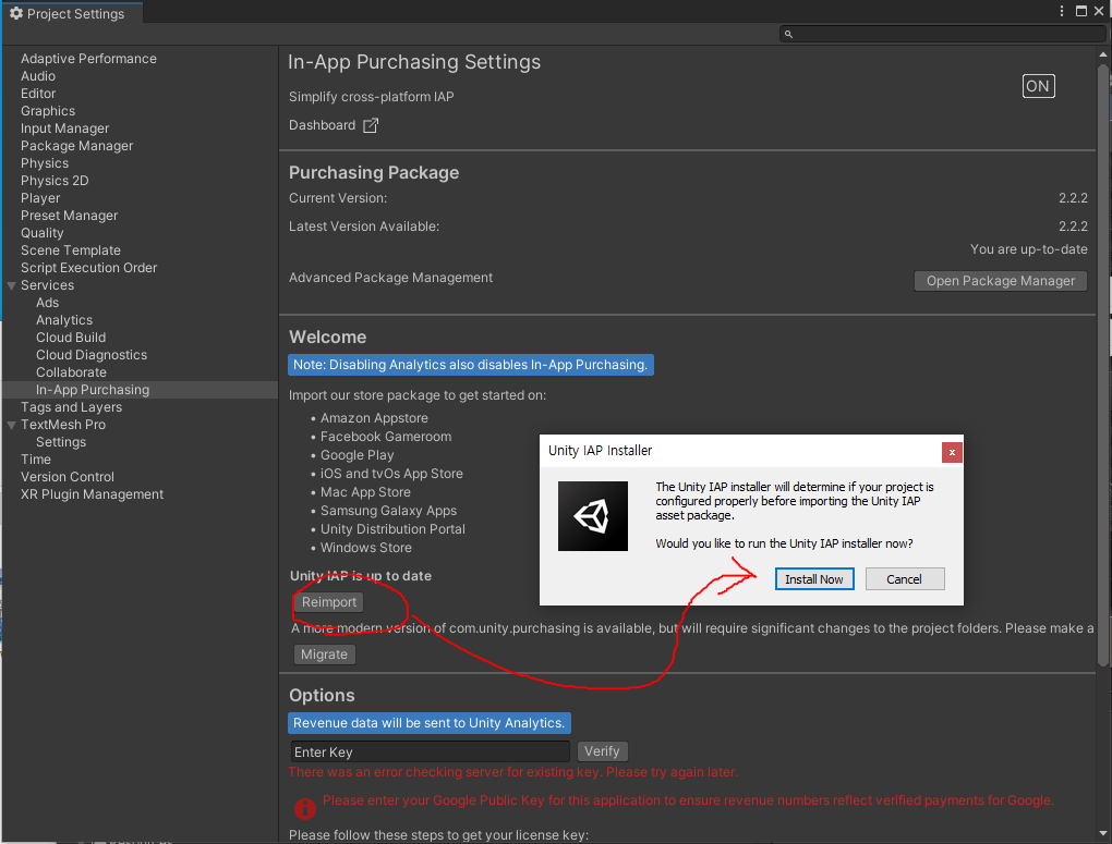 되어 있는데 눌러 줍니다, "Unity IAP Installer"창이 나오는데 여기에서 "Install Now" 버튼을 눌러 줍니다.