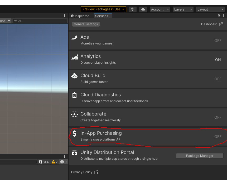 "Unity IAP" 란이 생겼을 것이다 만약 없다면 다시 맨처음 위로 돌아가서 다시 하나씩 과정을 거쳐가면 된다.