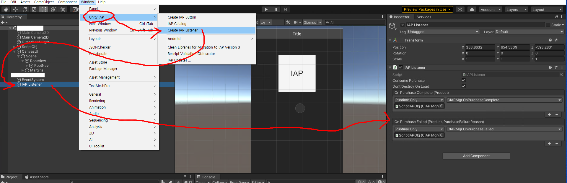 "그림15"를 보시면 "IAP Listener"오브젝트가 생기는 걸 볼 수 있습니다. "IAP Listener"의 오른쪽의