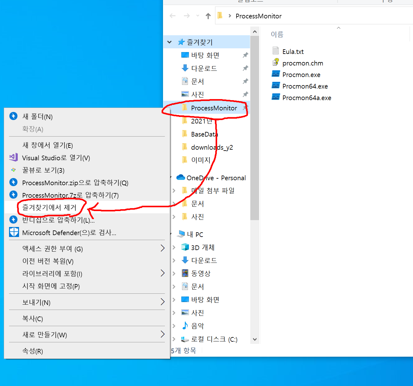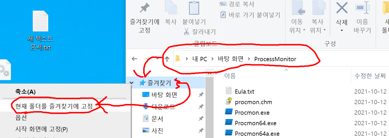 여기 그림화면에선 "바탕화면\ProcessMonitor\" 탐색기 폴더에서 들어가 왼쪽에 보시면 "즐겨찾기"폴더가 보이는데