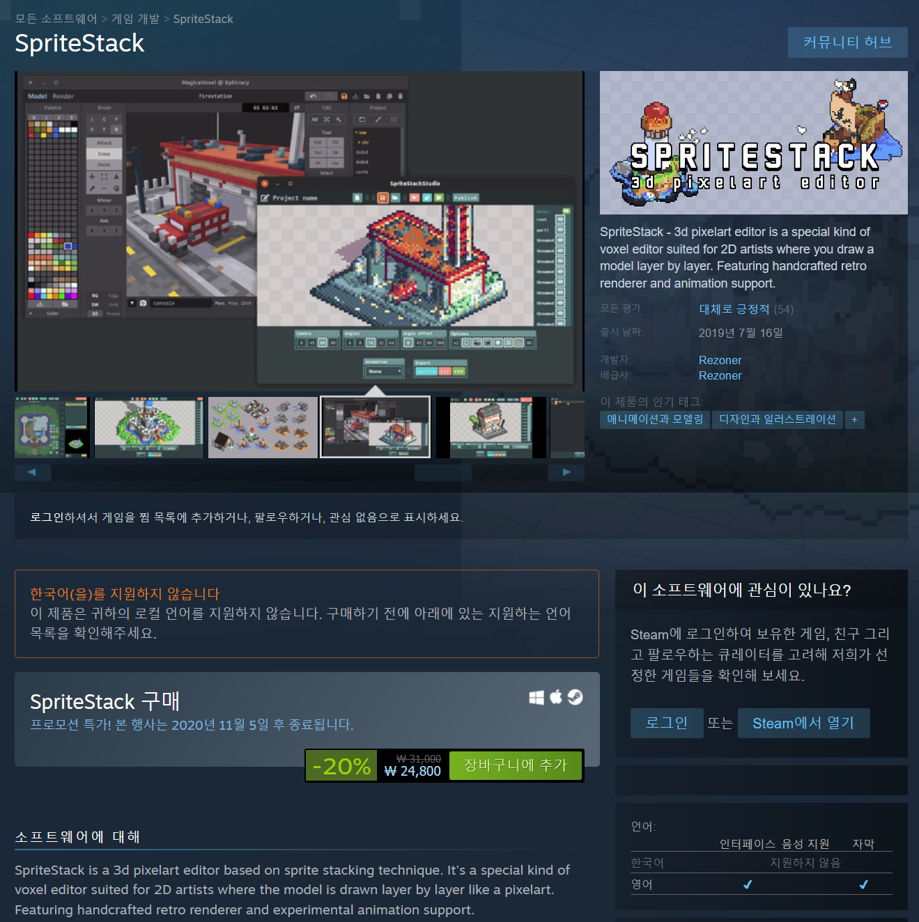 SpriteStack은 스프라이트 스태킹 기술을 기반으로 하는 3D 픽셀 아트 편집기입니다. 모델이 픽셀 아트처럼 레이어별로 그려지는 2D 아티스트에게 적합한 특수한 종류의 복셀 편집기입니다. 손으로 만든 레트로 렌더러와 실험적인 애니메이션 지원이 특징입니다.