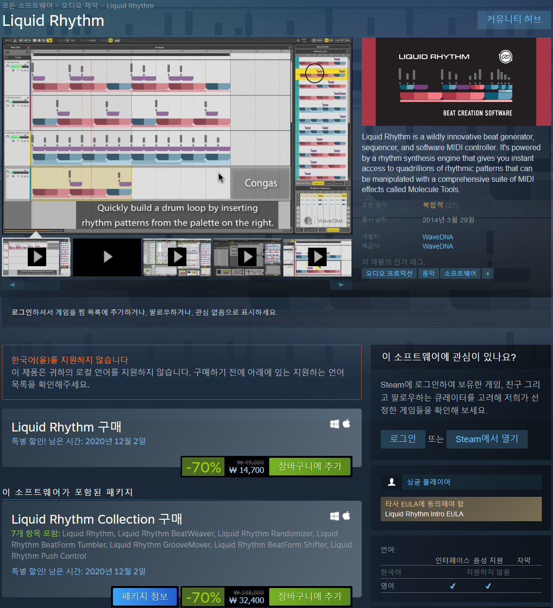 Liquid Rhythm은 매우 혁신적인 비트 제너레이터, 시퀀서 및 소프트웨어 MIDI 컨트롤러입니다. Molecule Tools라는 포괄적인 MIDI 효과 제품군으로 조작할 수 있는 수천억 개의 리듬 패턴에 즉시 액세스할 수 있는 리듬 합성 엔진으로 구동됩니다. MIDI 데이터에 대한 새로운 시각화를 제공하는 노트 클러스터 팔레트를 사용하여 드럼 패턴을 페인트하고, 멀티 샘플 드럼 악기 또는 자체 샘플을 사용하여 비트를 만들고, 독립 실행형으로 실행하거나 VST/AU/RTAS/Max for Live를 통해 워크플로에 통합합니다.