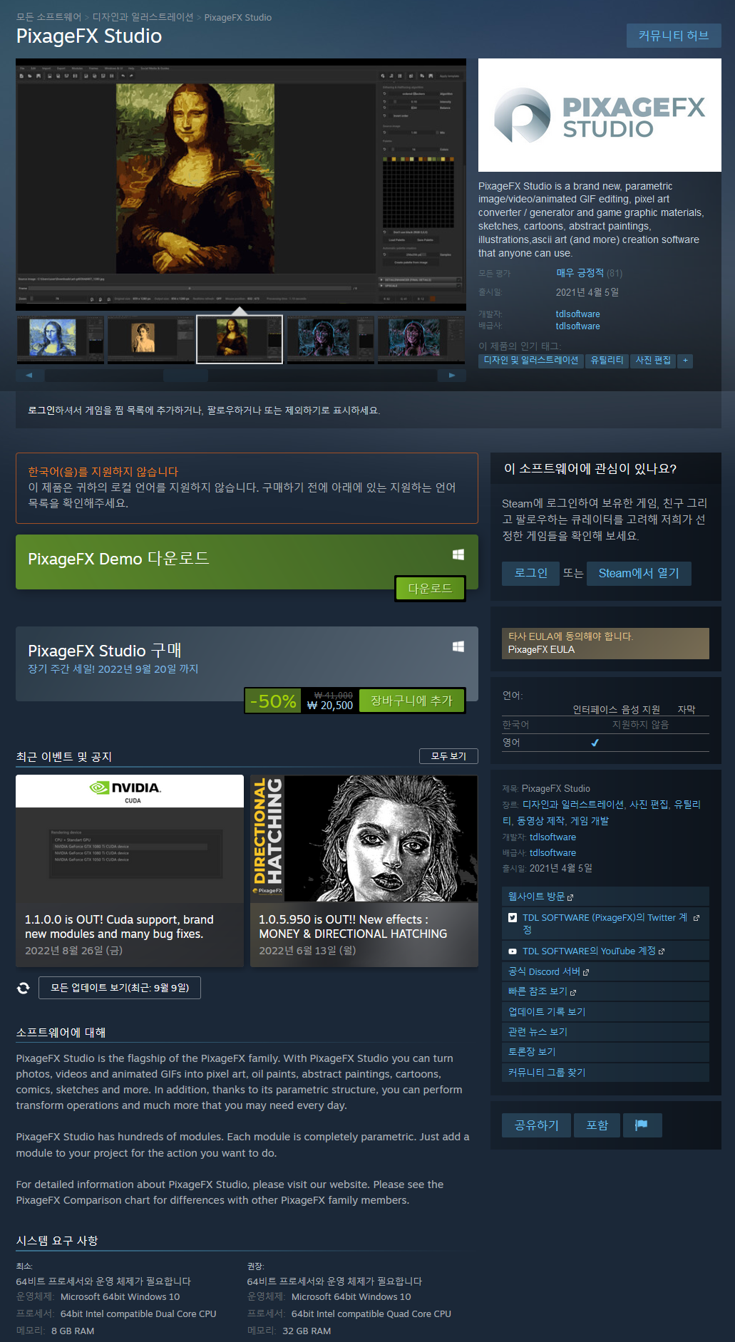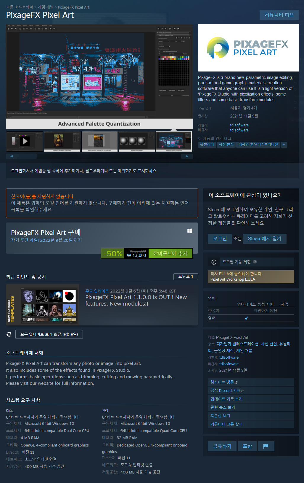 사진을 픽셀로 만들고 여러 가지 필터로 꾸미는 소프트웨어입니다. 꼭 사진이 아니라 3D 조형 같은 것도 픽셀로 만들 수 있어요. 필요한 사물의 사진을 픽셀화하고 에이스프라이트 같은 툴로 다듬으면 도트 찍는 데 들이는 시간이 급격히 줄어 듭니다. 게임 만들려고 무작정 손으로 도트 찍다가 작업량이 너무 많아서 이미지 도트화 사이트를 이용했는데 무료 사이트는 아무래도 옵션 조절이 힘들다보니... 전반적으로 좋은 프로그램입니다. 할인 기간에는 가격도 저렴하고요.