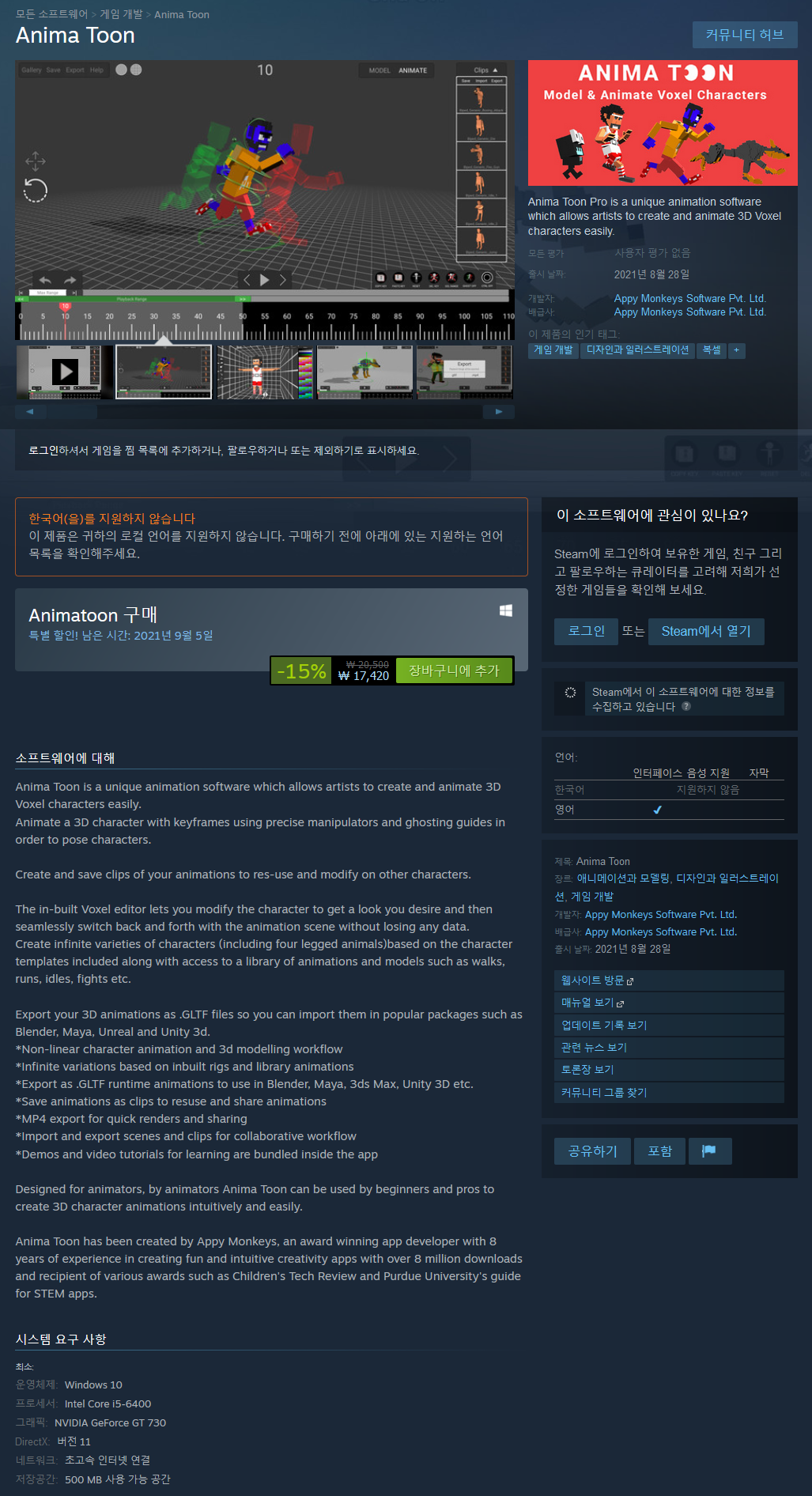 Anima Toon은 아티스트가 3D Voxel 캐릭터를 쉽게 만들고 애니메이션할 수 있는 고유한 애니메이션 소프트웨어입니다. 캐릭터의 포즈를 취하기 위해 정확한 조작기와 고스팅 가이드를 사용하여 키프레임으로 3D 캐릭터를 애니메이션합니다. 복셀 3D모델링, 애니매이션을 생각하시는 분들에게 생각해볼 툴 일 것 같습니다.
