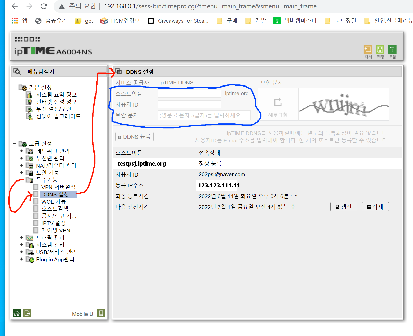 공유기 설정에 들어가 "그림6"에서 보면 "고급설정>특수기능>DDNS설정"에 들어가면