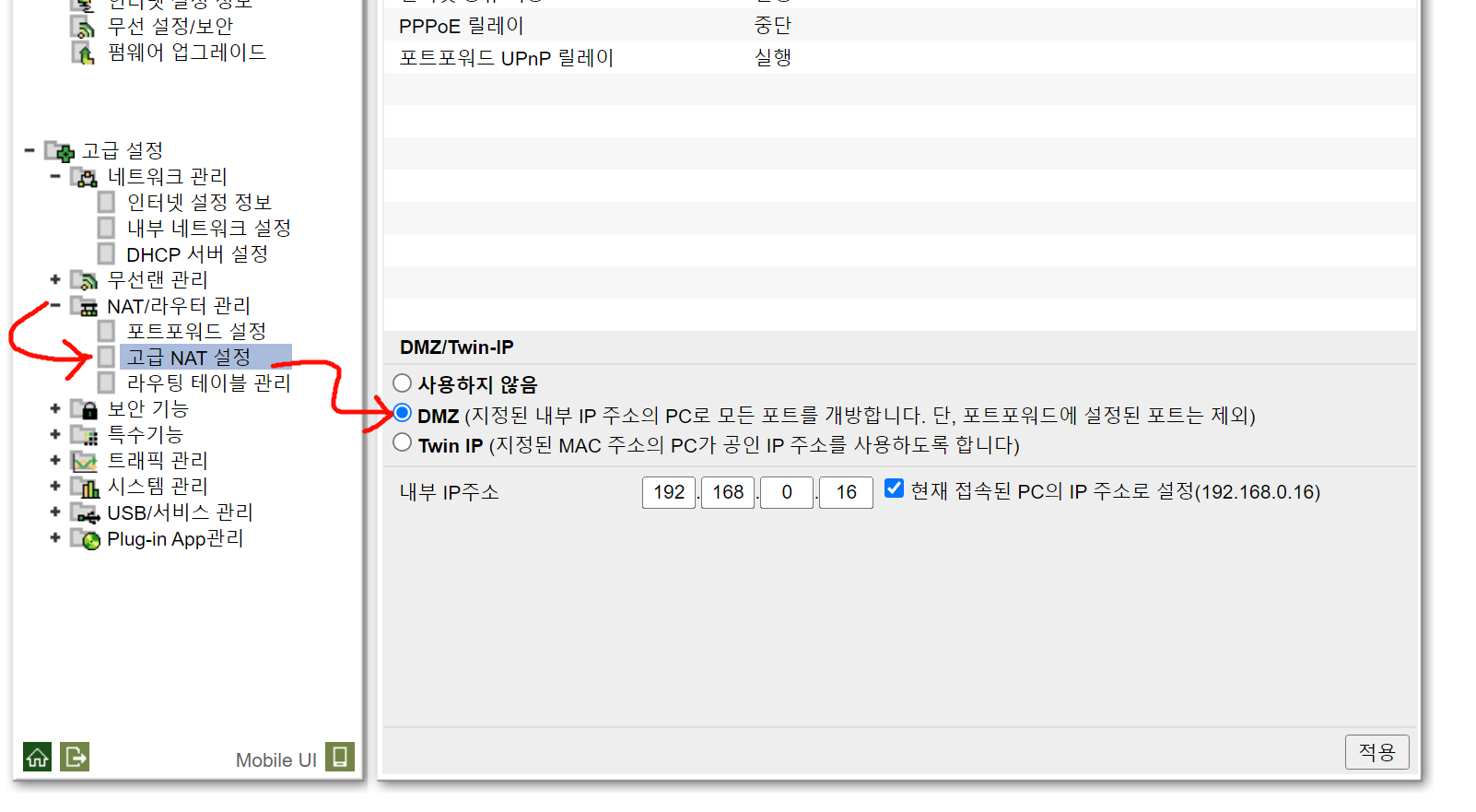 - 공유기의 접속된 가상아이피주소(예:192.168.0.11)라고하면 DMZ설정으로 공유기에