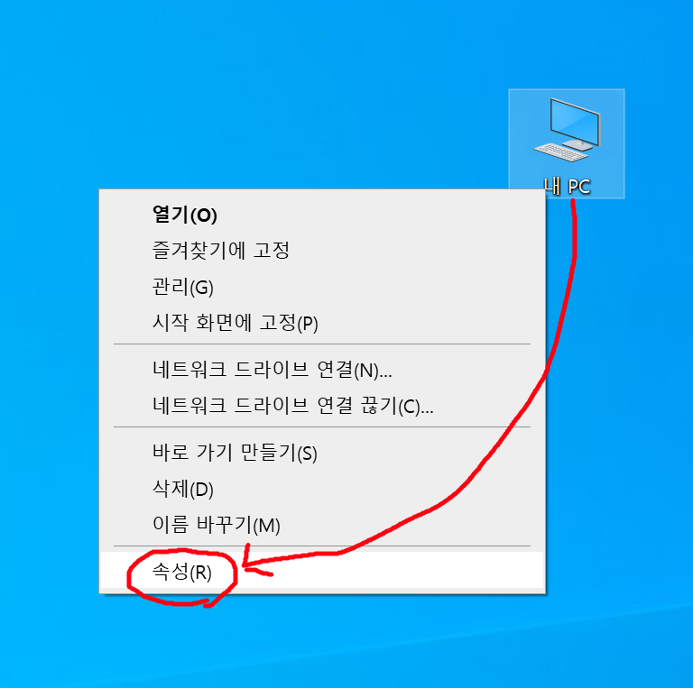 "내PC"에 '마우스 우클릭'을 해주고 속성을 눌러주자.