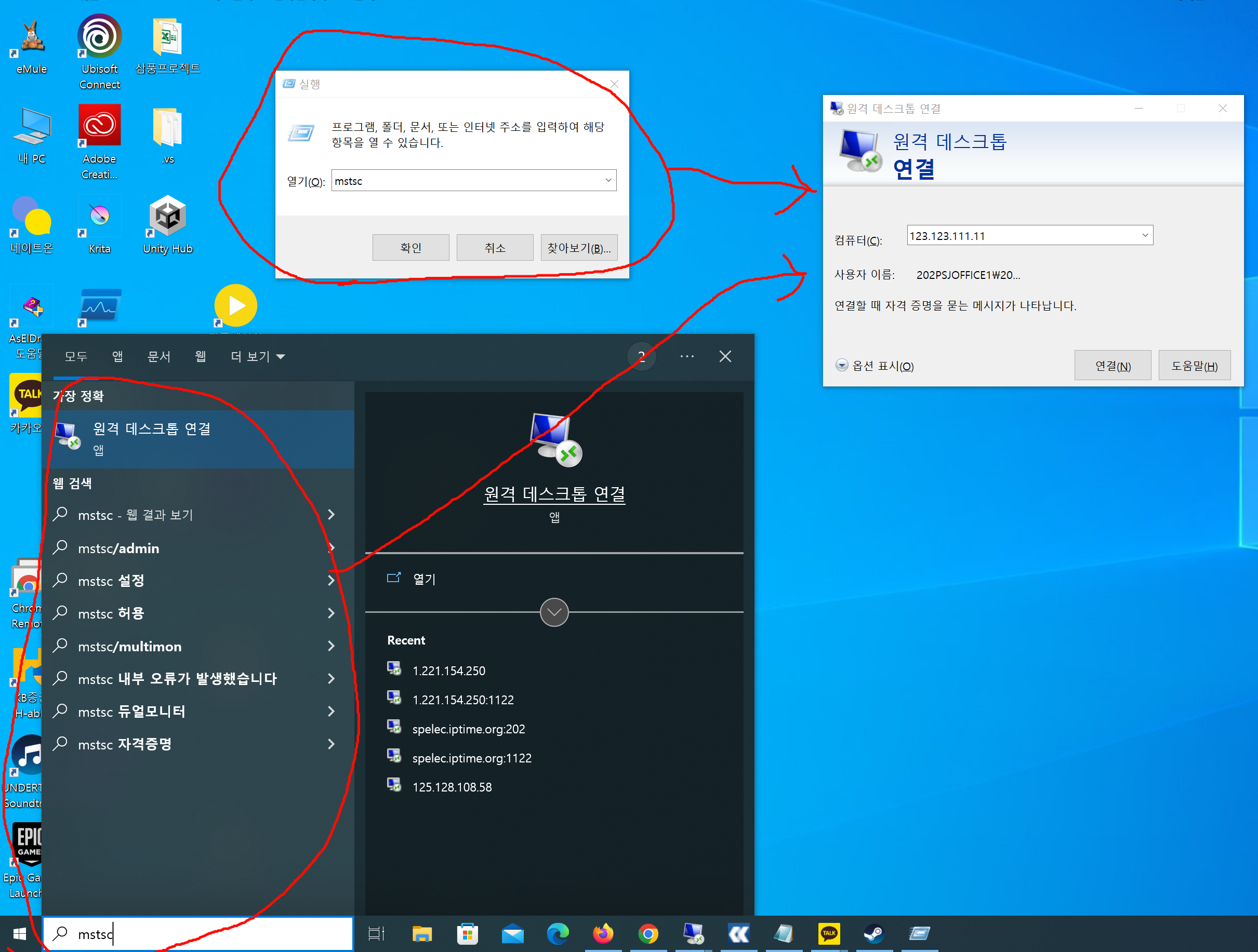 윈도우->"윈도우키+R"->실행창->입력: mstsc ->원격팝업창