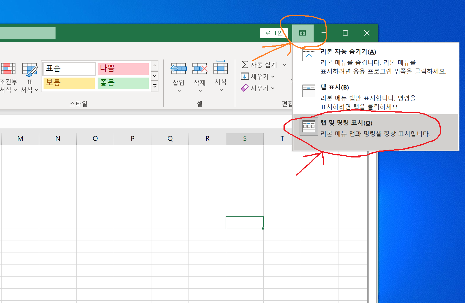 리스트박스에서 "리본 자동 숨기기", "탭 표시" 부분을 눌러주면 된다.