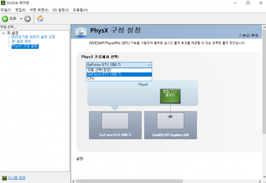 3D설정 후, 3D 설정 - Phys X 구성 설정 - PhysX 프로세서 선택에서 본인의 그래픽 카드 적용. 난 GTX 1050Ti로 뜸. 개인마다 다르다.
